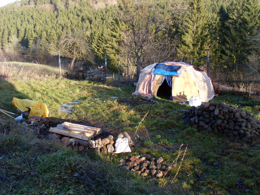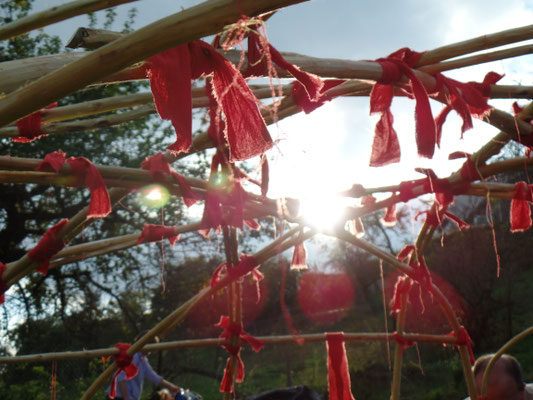 Die Schwitzhütte besteht aus einem Weidengeflecht welches mit Wolldecken abgedeckt wird. In der Mitte ist eine Kuhle für die heißen Steine.